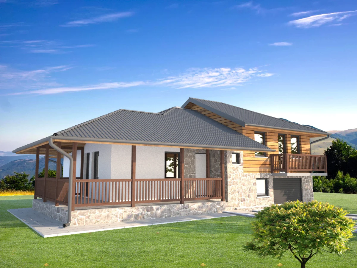 Montažna kuća NV-105 građevinske bruto površine 122,38 m2(neto površine 111,57 m2) po tipologiji je poluspratna, kaskadna varijanta. Prizemni deo je od čvrstog materijala, (garažno-podrumski), a stambeni deo sadrži tri spavaće sobe, kupatilo, wc, ostavu, kuhinju i dnevni boravak sa trpezarijom. U gornjoj etaži je sadržan spavaći deo u čijem nivou je i kupatilo. Ispod višeg dela je garaža sa podrumskim prostorima koji se mogu prilagoditi različitim namenama. Dnevni deo sa trpezarijom je jednostavne pravougaone orjentacije, a kuhinjski deo sa ostavom je odvojen od ove udobne i društvene prostorije. Dinamičan krov razdvojen u dve celine daje prepoznatljiv izgled ovakvih tipova kuća.